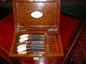 All is successful and then Bennica adds the last touch of class to the work making a casket to contain the fruit of the job of many knivesmaker and it is realized by digging a thik block of Indonesian amboina root and subsequently decorated with ivory by the hand ot the French engraver Sandrine Lautier.