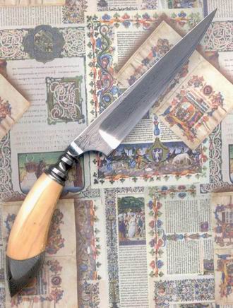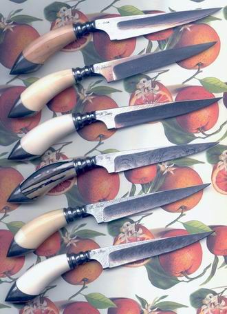 Charles Bennica is very enthusiastic of the forging job of his friends and colleagues and he thinks to give a personal touch even to the handle of the knives and chooses to implement them with fossil ivory mastodon, elephant, warthog, hippo and mammuth, this last in the clear and darken tonality.
