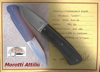 Attilio “Atti” Morotti inizia la fase progettuale eseguendo su carta dei semplici schizzi delle forme del coltello, disegni che vengono poi elaborati e trasferiti con la massima cura delle misure e dei dettagli su carta da lucido. A richiesta viene utilizzato anche il disegno del committente. Come acciaio viene impiegato prevalentemente RWL 34, damasco inox e damasco al carbonio. Per le guancette si utilizzano tutti materiali naturali come la madreperla, osso, corno, legni stabilizzati ecc. e materiali compositi che vengono realizzati appositamente come la fibra di carbonio, fibra di vetro blu, grigia, oro, antracite oppure multicolore. Per garantire una vera costruzione artigianale l'impiego di macchinari è ridotto al minimo, e questo fa in modo che ogni pezzo realizzato sia il più unico possibile.